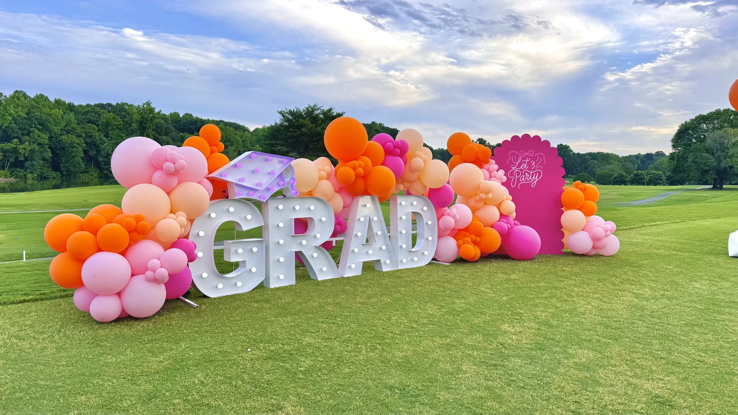 Corporate events, larger events, backdrops, marquee letters, flower walls, and full-service balloon decor.